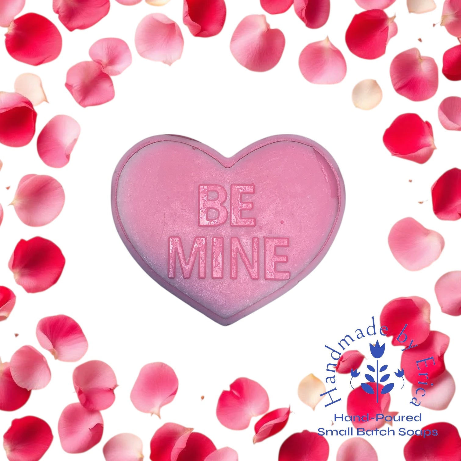 A fruity and fun blend with notes of strawberry, peach, mango, orange, and ylang ylang. Available as a large approximately 3 ounce bar shaped like a conversation heart or a set of 12 minis with a total weight of approximately 4.7 ounces. Colors and messages are selected at random for a unique surprise! Each bar is hand-poured and completely unique!