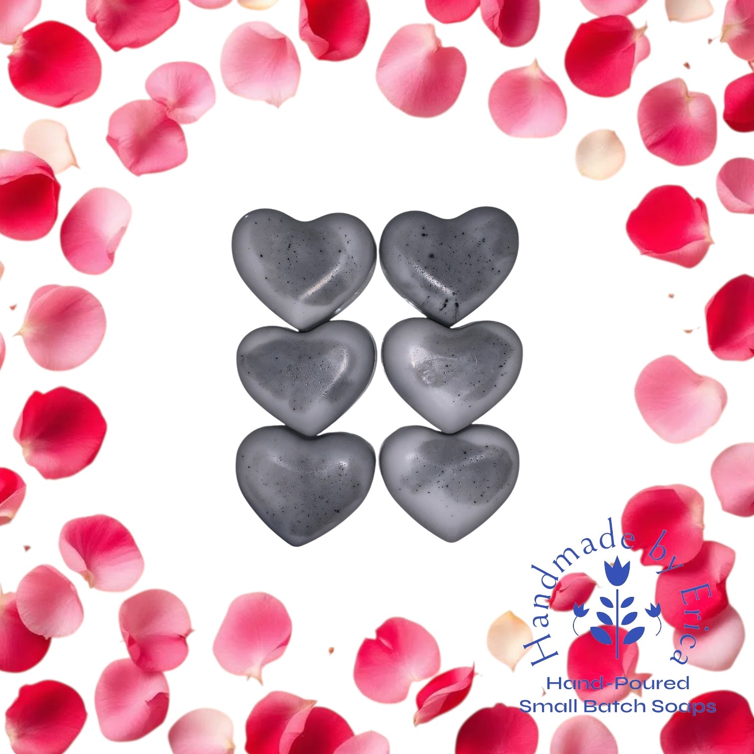 A romantic but dark blend of vanilla, cinnamon, black orchid, and leather. Each set of 6 white mini hearts has a total weight of approximately 3.4 ounces and is marbled with gray mica. Each bar is hand-poured and completely unique!